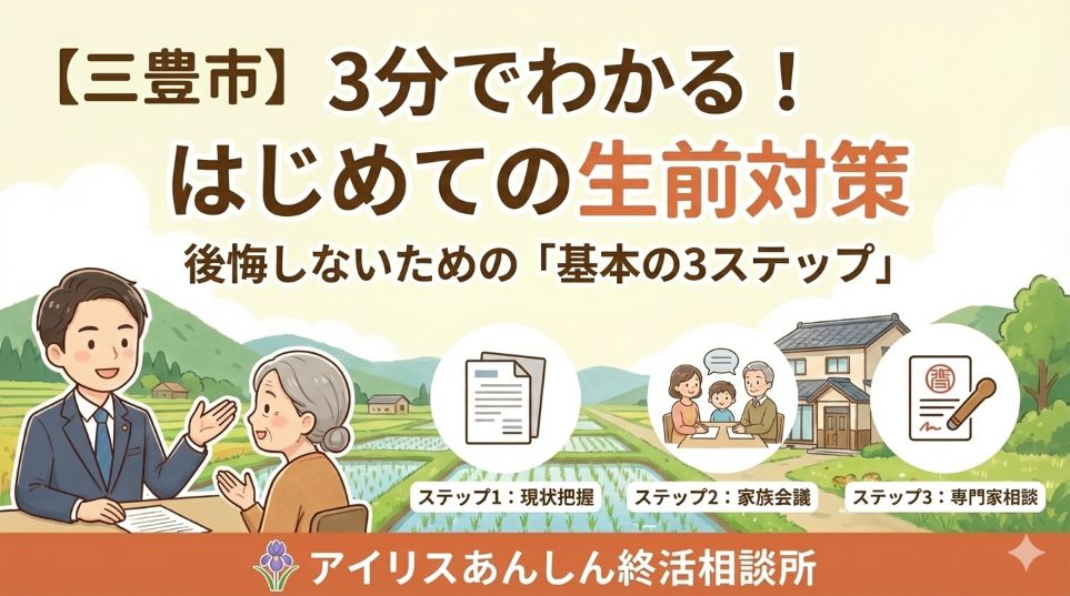 「生前対策って、何から手を付ければいいのかわからない」「うちは普通の家だから、まだ早い気がする」 そう思っているうちに時間は過ぎ、いざという時に「もっと早く準備しておけばよかった」と後悔されるご家族を、私たちは三豊市で数多く見てきました。
