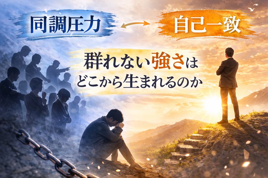 人と違ってもいい。嫌われる可能性があっても、自分の内側と外側が一致している状態こそが、本当の意味での精神的自立です。本記事では、なぜ人は同調してしまうのか、そしてどうすれば自己一致を取り戻せるのかを心理学と哲学の両面から掘り下げます。